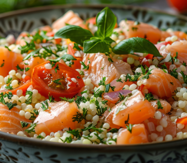 Marmolado de salmón y pesca blanca, especias, ensalada de vegetales cocidos