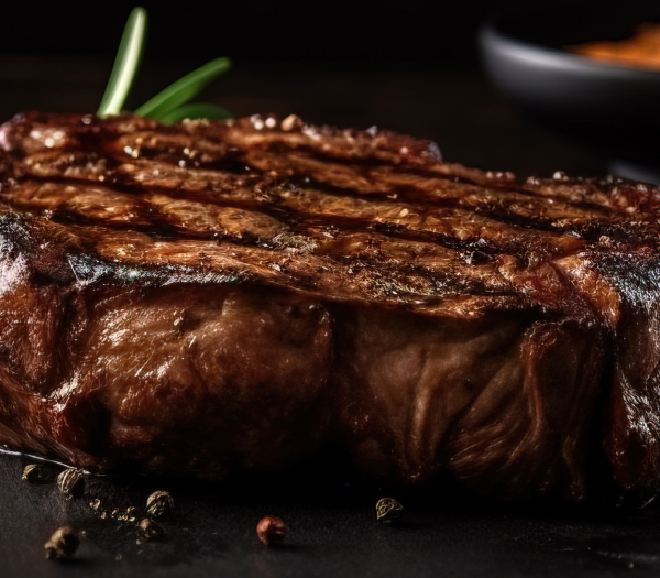Carne de res cocida a baja temperatura servida con su jugo, emulsión de papa y morrones ahumados